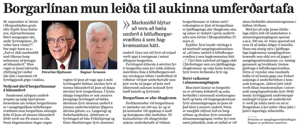 Greinar eftir Elías B. Elíasson verkfræðing, Ragnar Árnason hagfræðing og prófessor emeritus og Þórarinn Hjaltason samgönguverkfræðing.