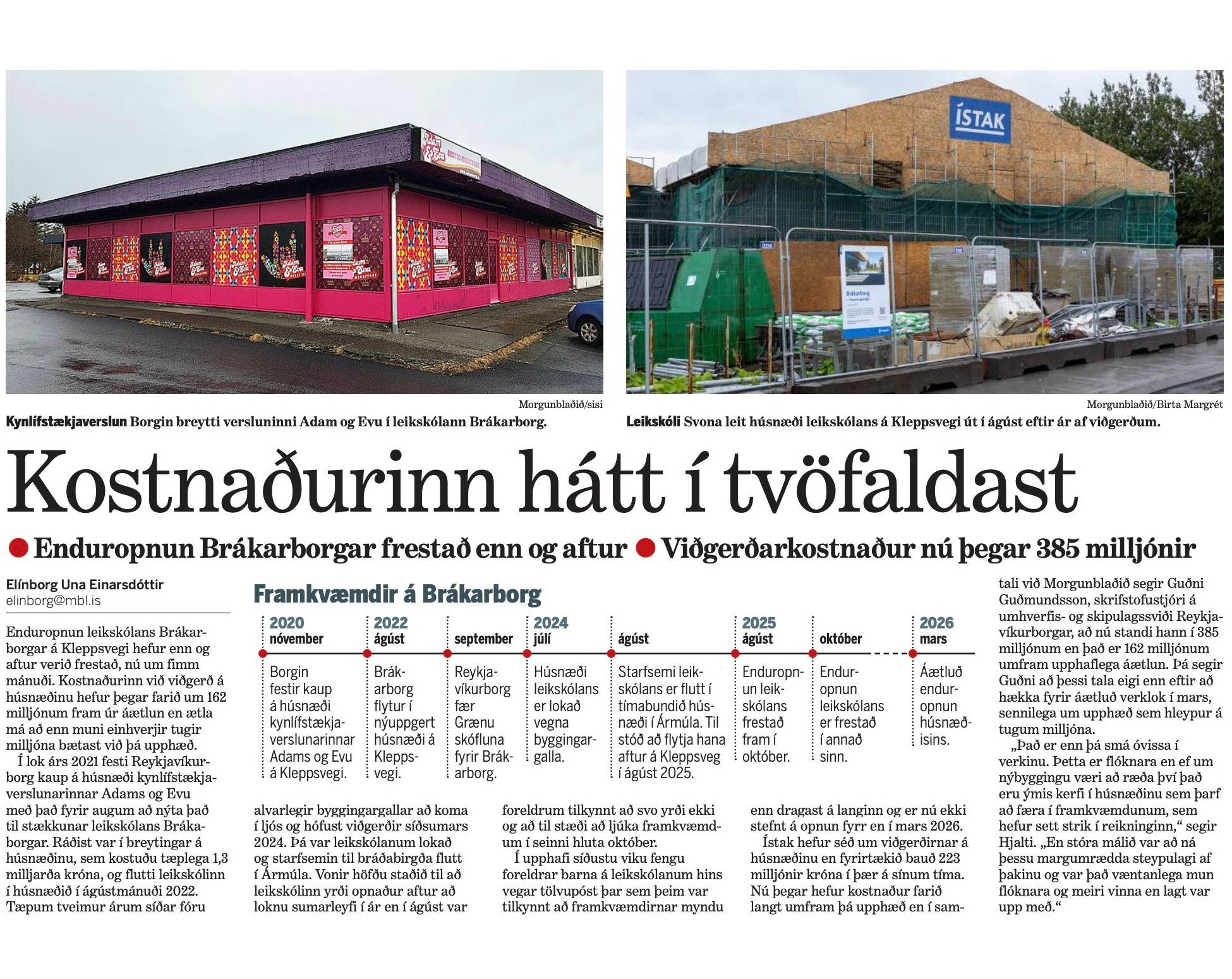Kostnaðurinn stendur nú í 3,8 milljörðum og verkinu er ekki enn lokið og leikskólinn ekki opnaður! Til samanburðar kostar fullbúinn 100 barna leikskóli um 1,2-1,4 milljarða. Hver ber ábyrgðina á að þessi leikskólabygging kosti orðið meira en þrír nýjir leikskólar og muni væntanlega kosta eins og að byggja fjóra nýja leikskóla?